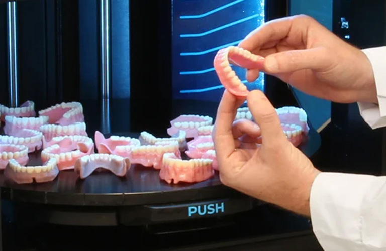 En af de største fordele ved J5 DentaJet er dens evne til at kombinere flere materialer og farver i et enkelt print. Sammen med et automatiseret, ubemandet workflow og minimalt efterarbejde gør det det muligt at producere store mængder med høj præcision, samtidig med at behovet for manuelle operationer reduceres.